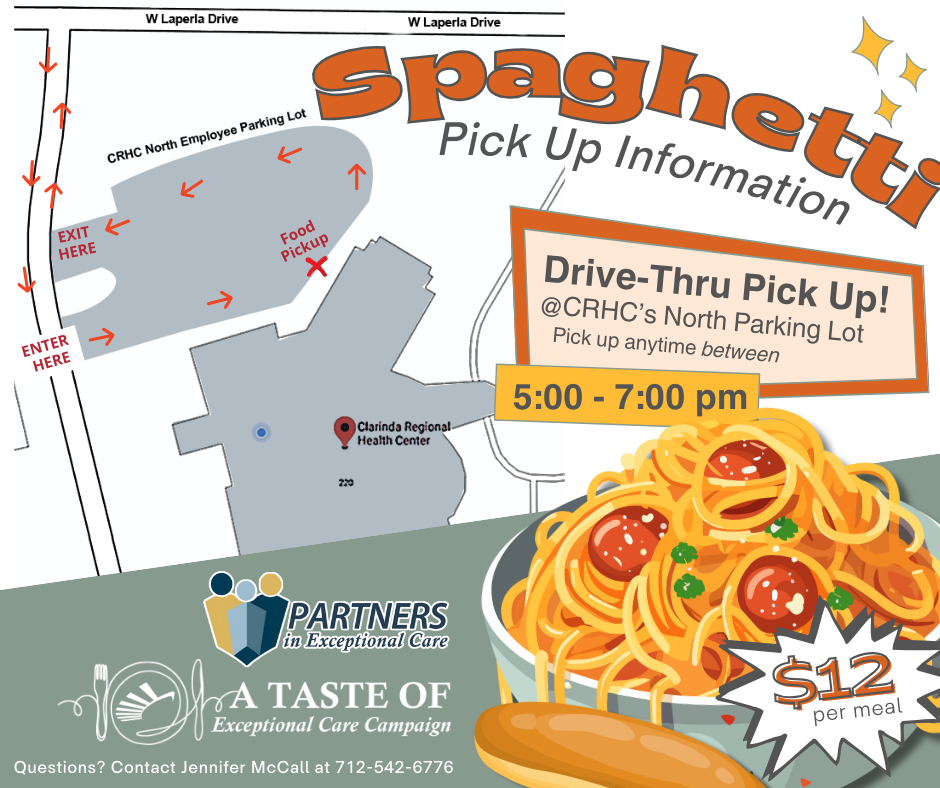 On December 10th, enjoy a hearty spaghetti dinner you can drive up and take home, all while supporting Partners in Exceptional Care "Taste of Exceptional Care", fundraising campaign to renovate CRHC's cafeteria and dining area. Your meal doesn’t just fill your plate; it helps us create a more welcoming space for patients, visitors, and staff to enjoy for years to come.